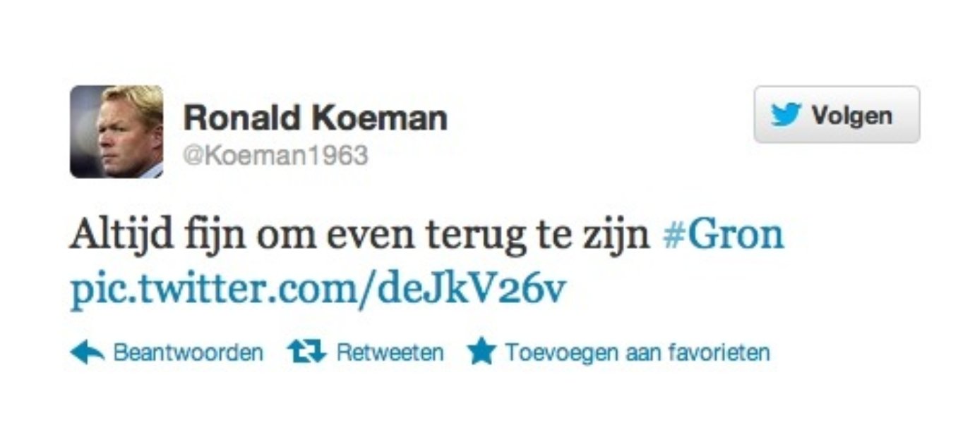 Als voorbeeld pak ik Feyenoordcoach Ronald Koeman. Naar buiten toe een rustige trainer die beheerst en weloverwogen zijn woorden uitkiest wanneer hij personen te woord staat, zelfs direct na wedstrijden. Afgelopen zomer meldde hij op het officiële thuisnet van Feyenoord dat hij actief zal zijn op Twitter onder @Koeman19633. De rustige en beheerste identiteit van Ronald Koeman komt echter niet over middels het Twitteraccount. De tweets hebben inhoud die bij hem past als trainer van Feyenoord, dat klopt prima. Maar de manier waarop het gebracht wordt, is niet hoe je dat in het echt gewend bent. Eenvoudig geanalyseerd heeft bijna driekwart van zijn laatste 20 tweets één of meerdere uitroeptekens in tweets. Hoor je Ronald Koeman dit op deze manier zeggen?