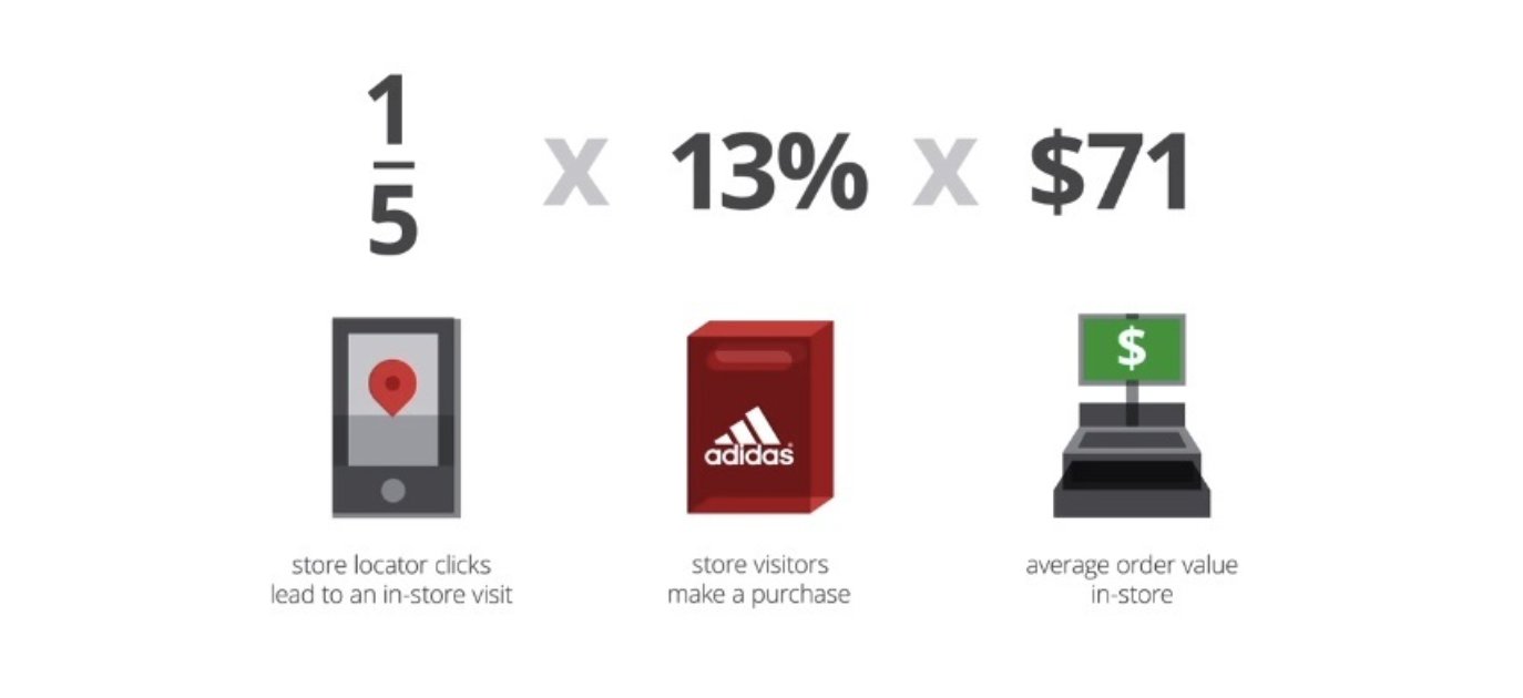 “'We zagen dat een grote groep mensen onze winkels via mobiel vonden. Aan ons de taak om een methodologie op te zetten waarbij we kunnen meten in welke mate klanten naar aanleiding van een zoekopdracht uiteindelijk een bezoek brengen aan de winkel en daar ook daadwerkelijk producten afnemen.” 1 op de 5 Store Locator-clicks bij de zoekopdracht adidas store resulteerde in een bezoek aan een winkel. 13 procent van de bezoeken leidde vervolgens tot een aankoop van gemiddeld $71. De aanpassingen voor mobiel (gebruikersgemak, vindbaarheid en service) zorgde zowel voor een stijging van het aantal aankopen (13 → 20 procent) als het gemiddelde verkoopbedrag ($71 → $80).