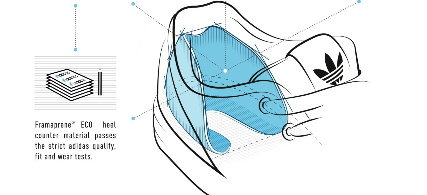 De hielondersteuning zit bedekt door andere materialen maar vormt een belangrijk onderdeel voor de stevigheid van de schoen. De samenwerking tussen de Framas fabriek en adidas loopt al sinds 1948. Onderstaand de infographic.