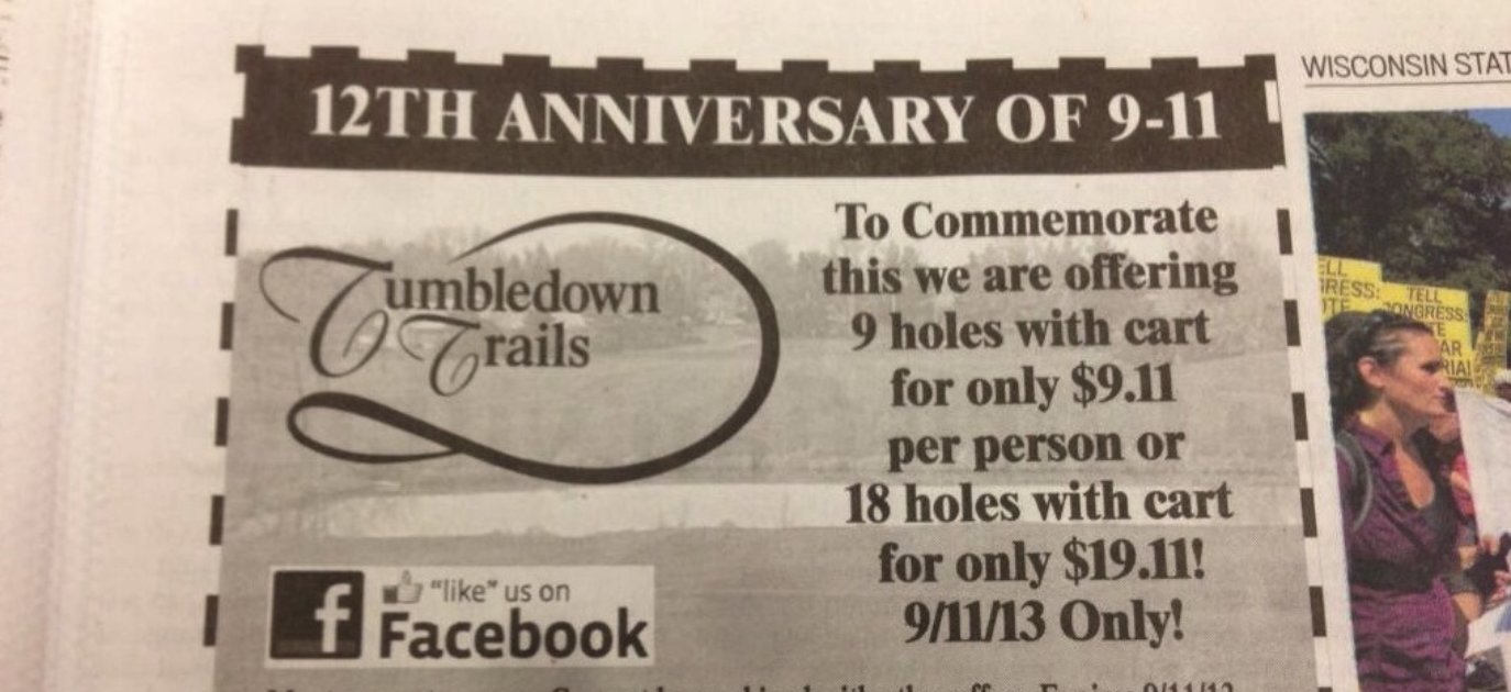 Een onbegrijpelijke advertentie van een golfbaan in de Verenigde Staten. Tumbledown Trails viert de twaalfde verjaardag van 9/11.